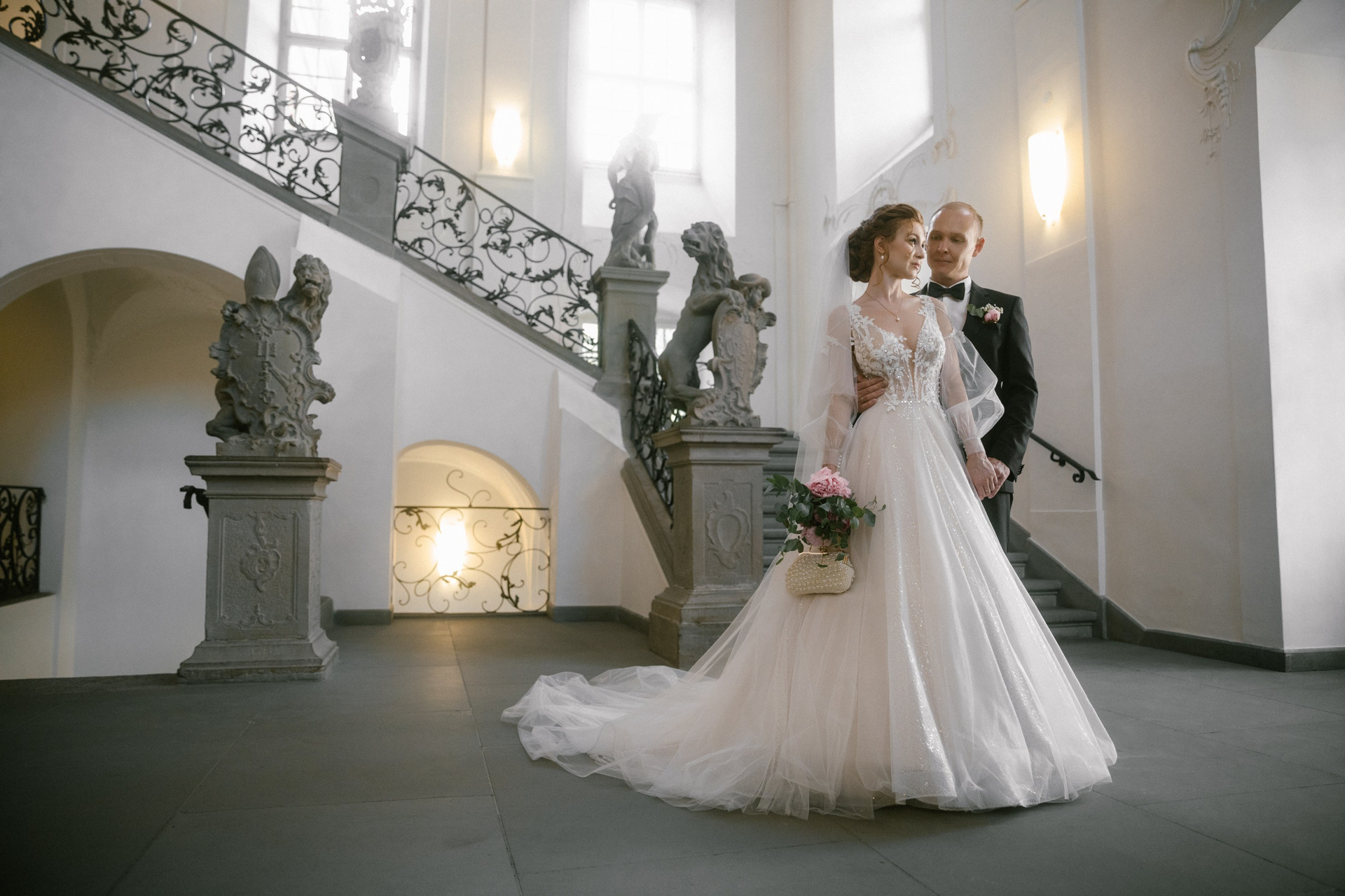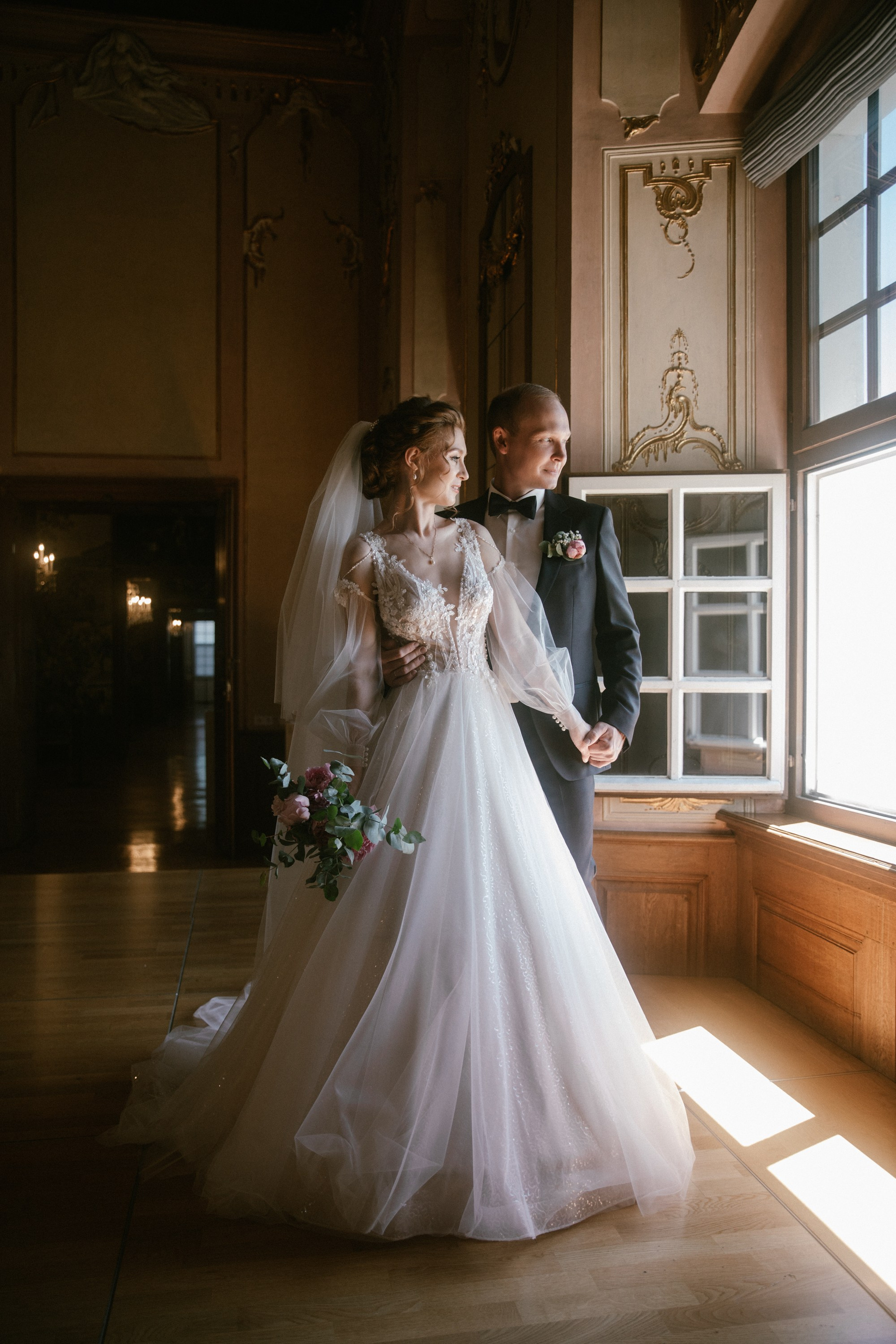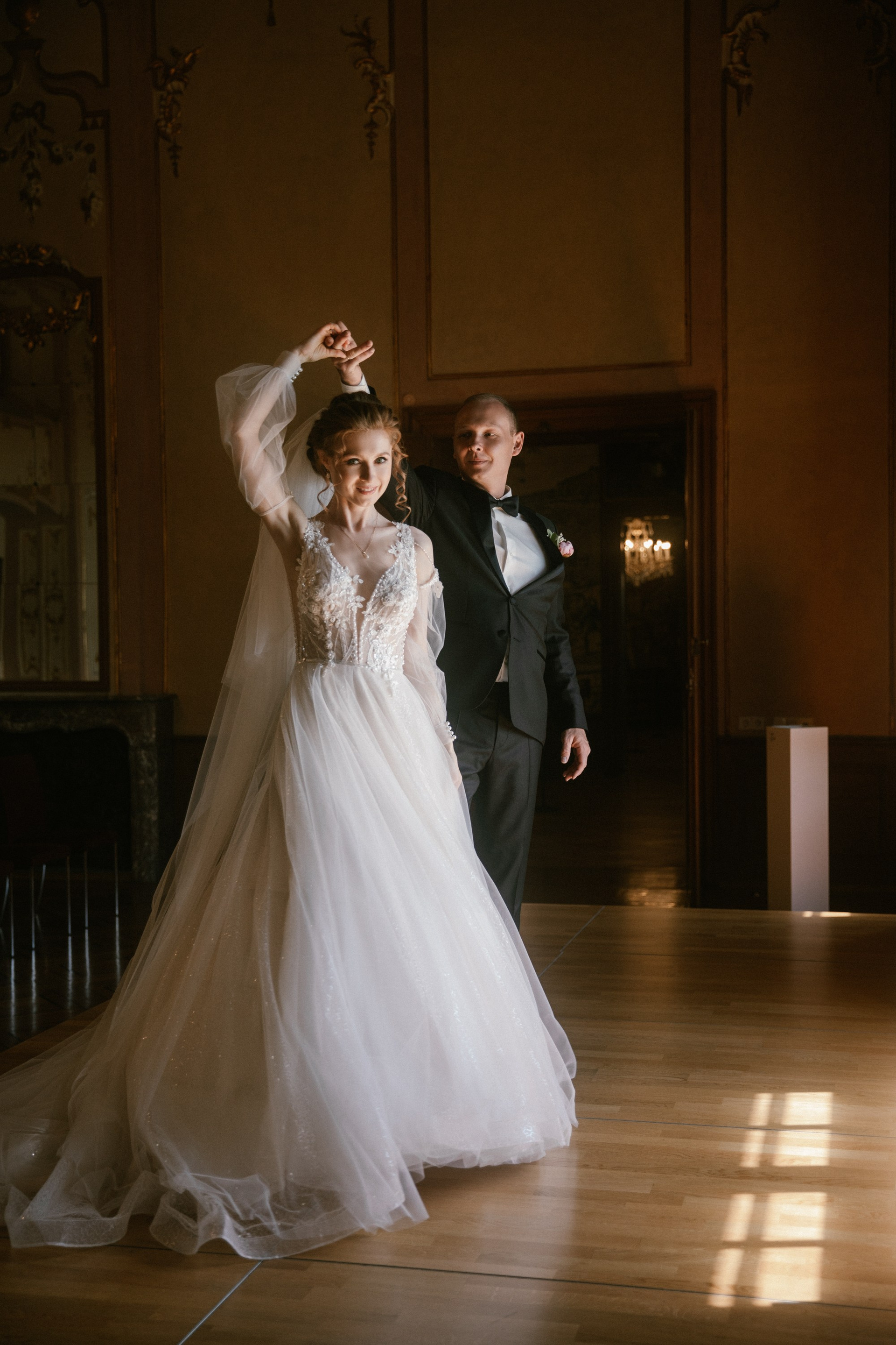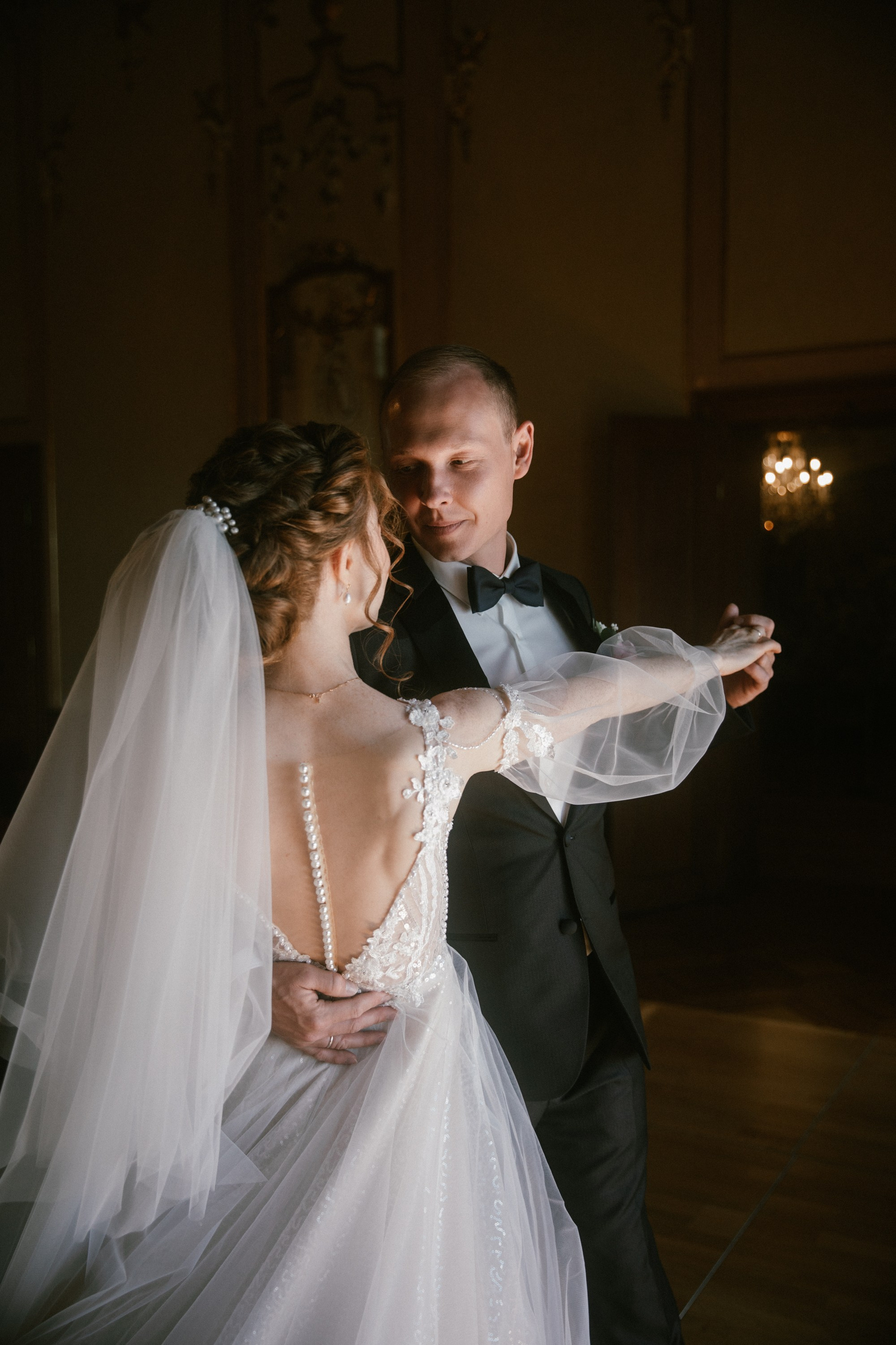 This photo story is about a dance of dreams by Marianna and Artjom — a quiet play of glances and touches within the walls of the castle. Light streamed through tall windows, softly embracing their silhouettes and setting delicate shimmers in the bride’s dress aglow. Their love revealed itself in gentle movements, as they laughed and held each other as if time belonged only to them. In that calm, untouched by outside voices, the rest of the world seemed to fade away.