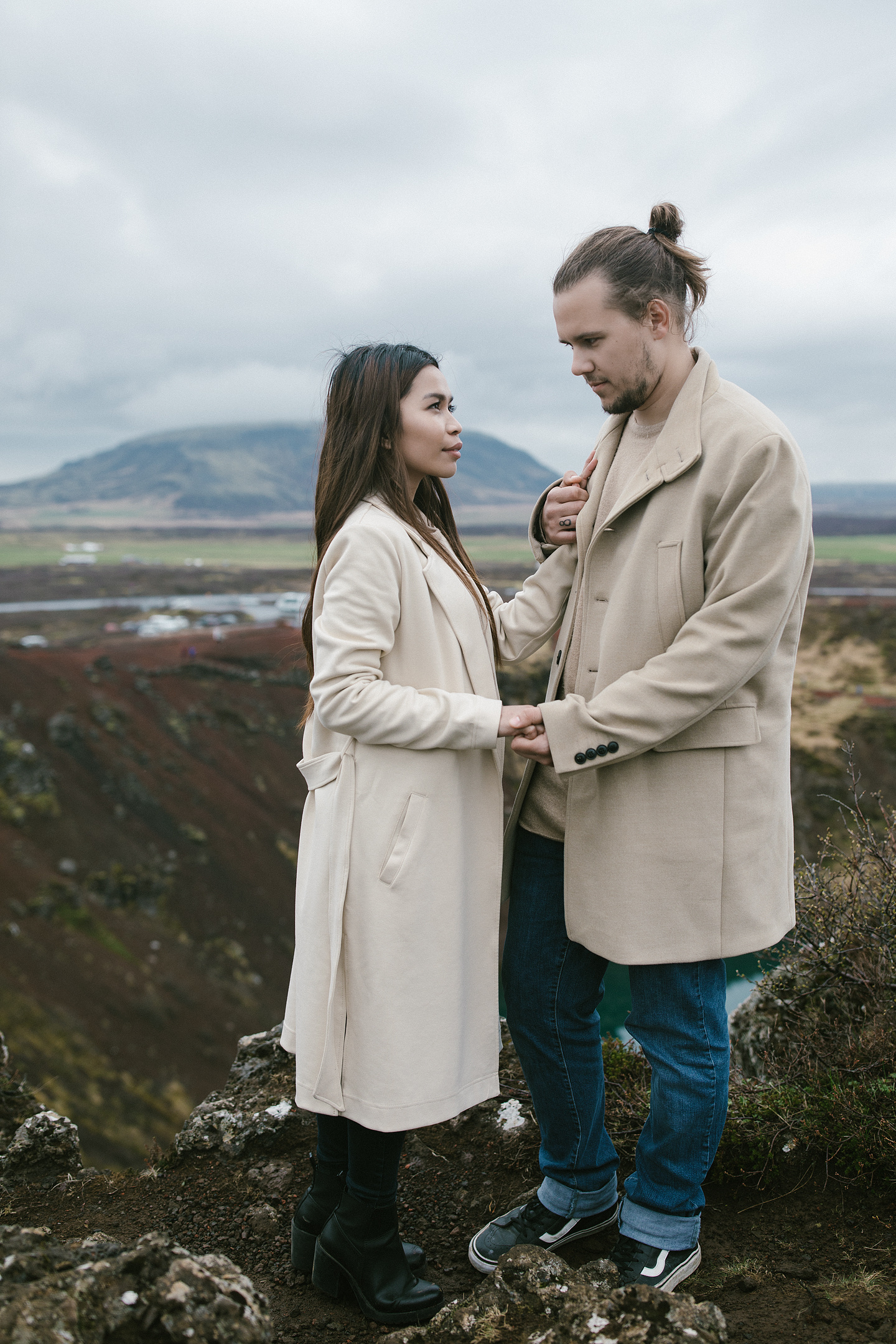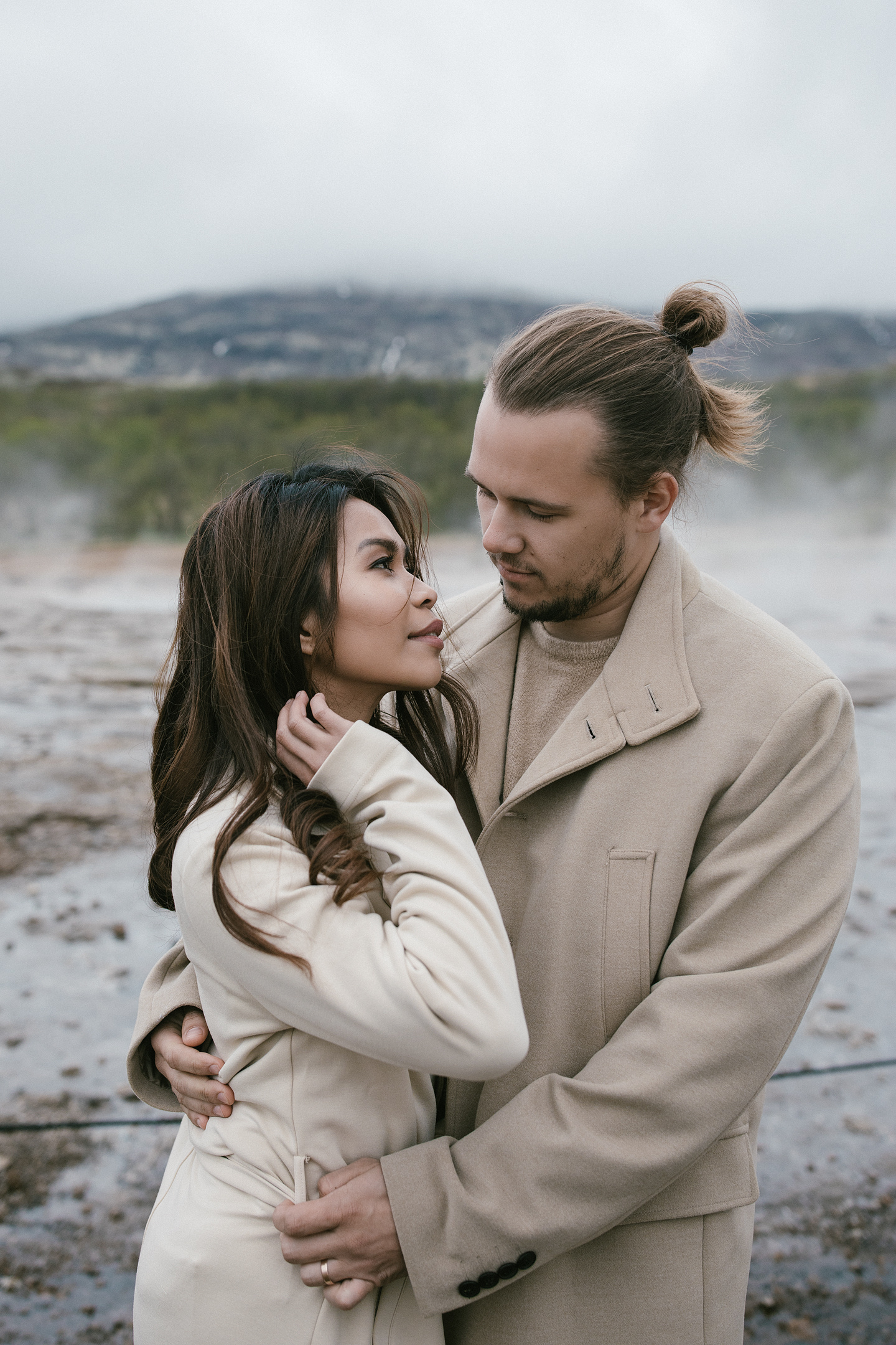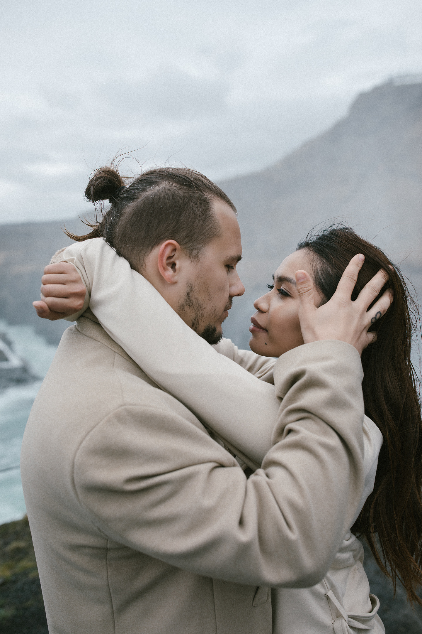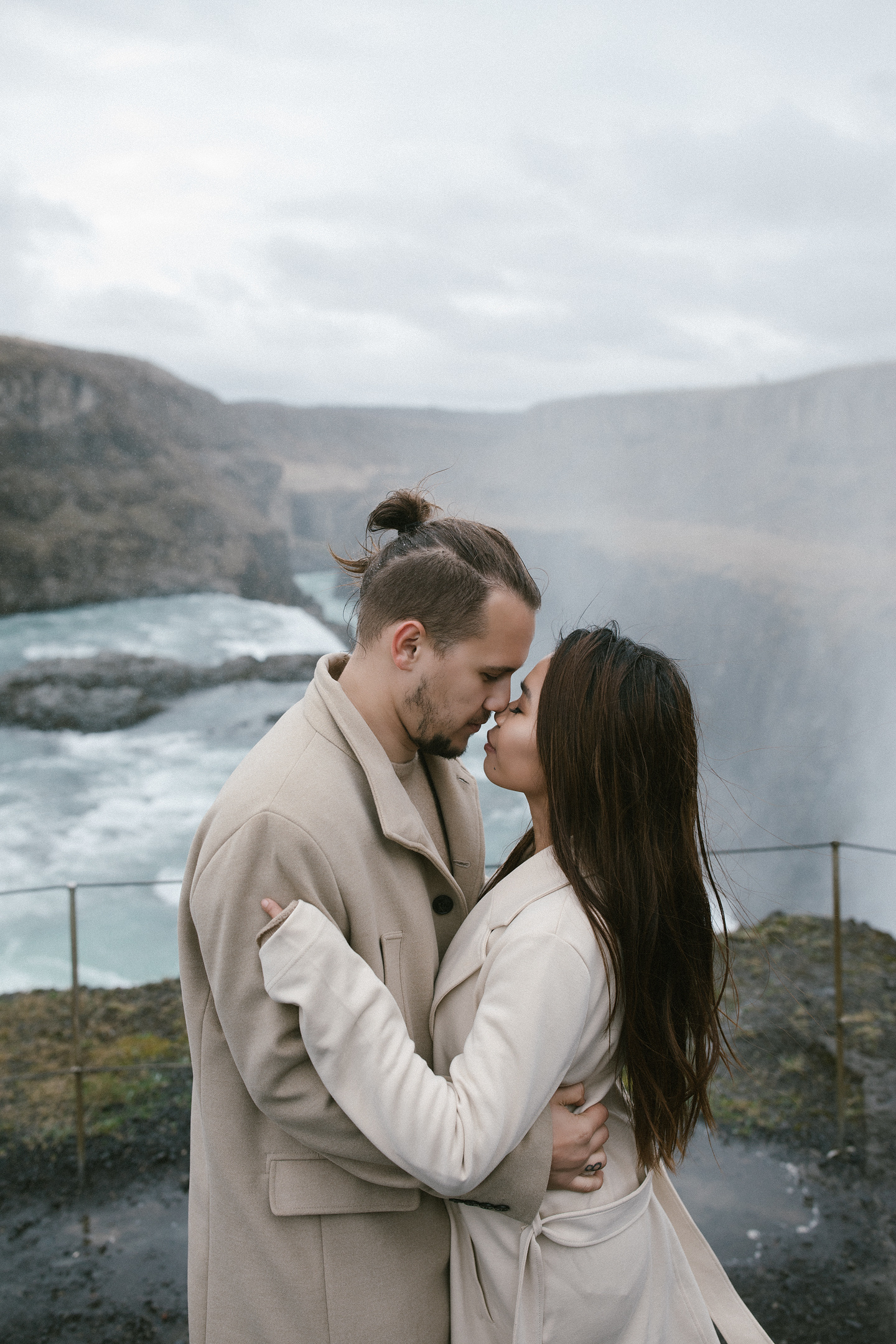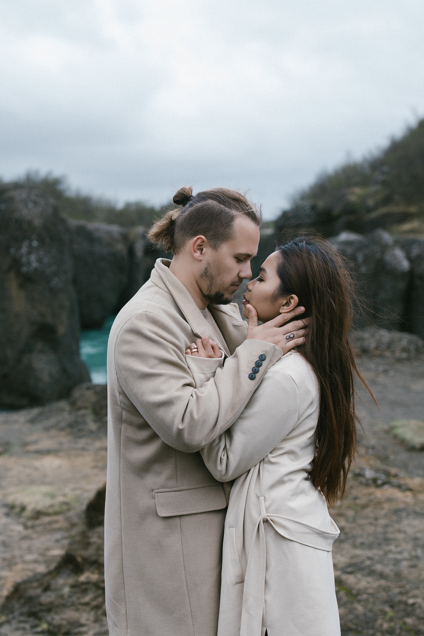 Neila & Nikita left Reykjavík to breathe in the wild air of Iceland. The roads carried them into a landscape that smelled of sulfur and pulsed with the steam of geysers. At Gullfoss, the mist settled into their hair like a secret blessing of water and wind. On their way, they stopped to feed Icelandic horses and admired the emerald waters of a canyon. Finally, at the crater lake of Kerid, where fire once yielded to water, they stood at the edge, whispered their love to each other, and descended to the lake. There, by the shore in the rain, they kissed — as if nature itself had blessed their union.