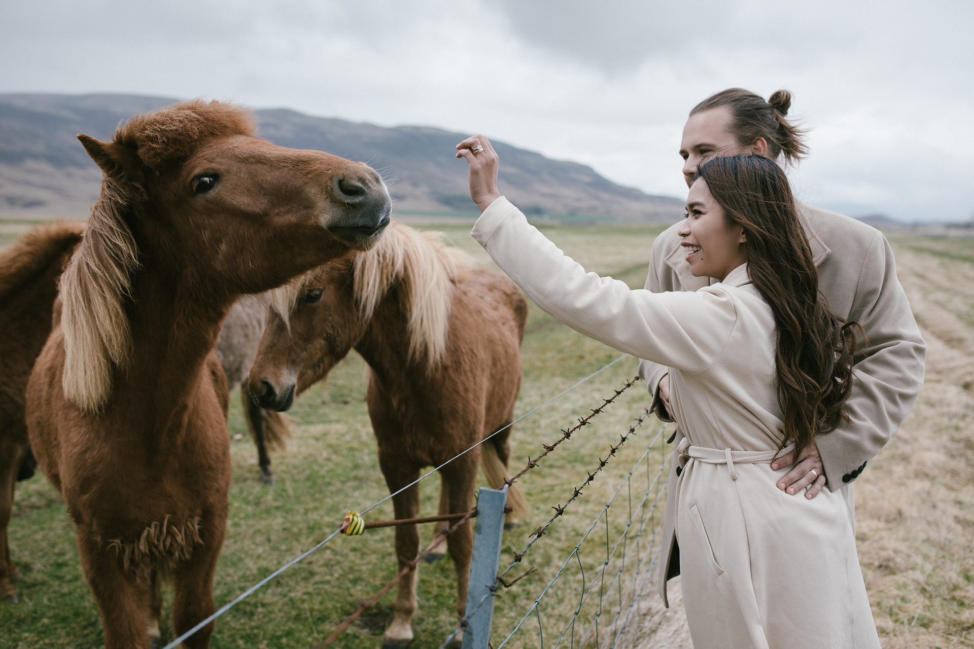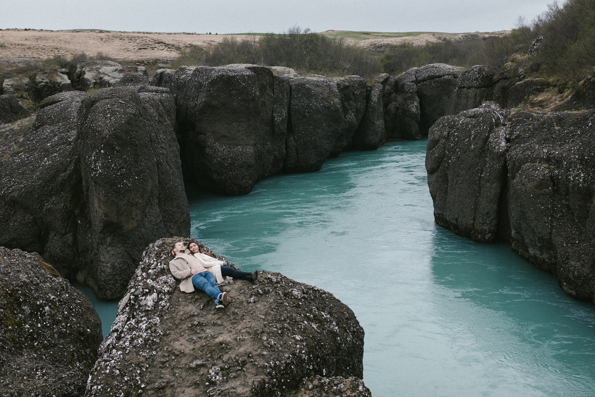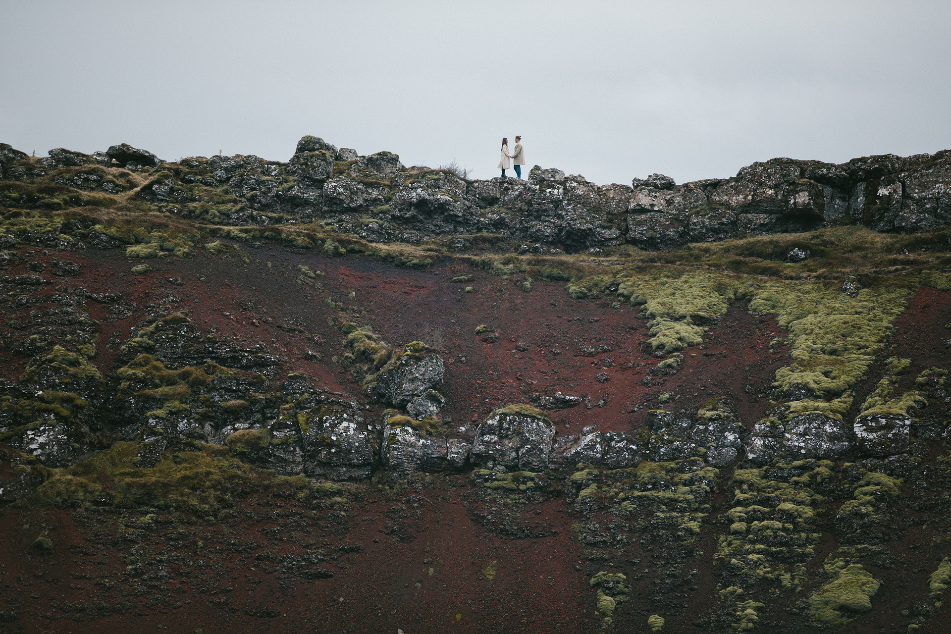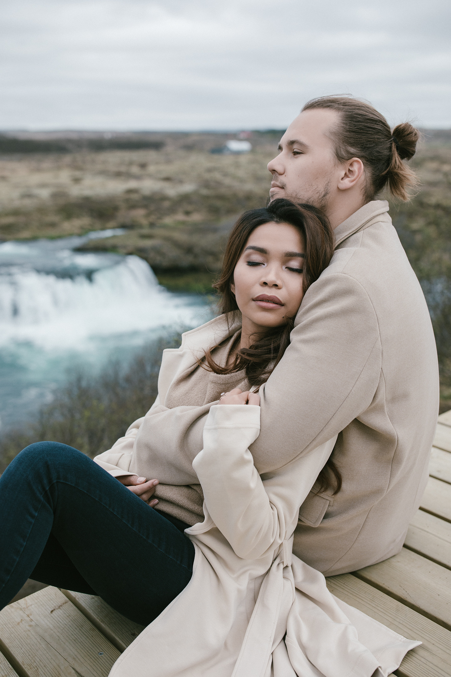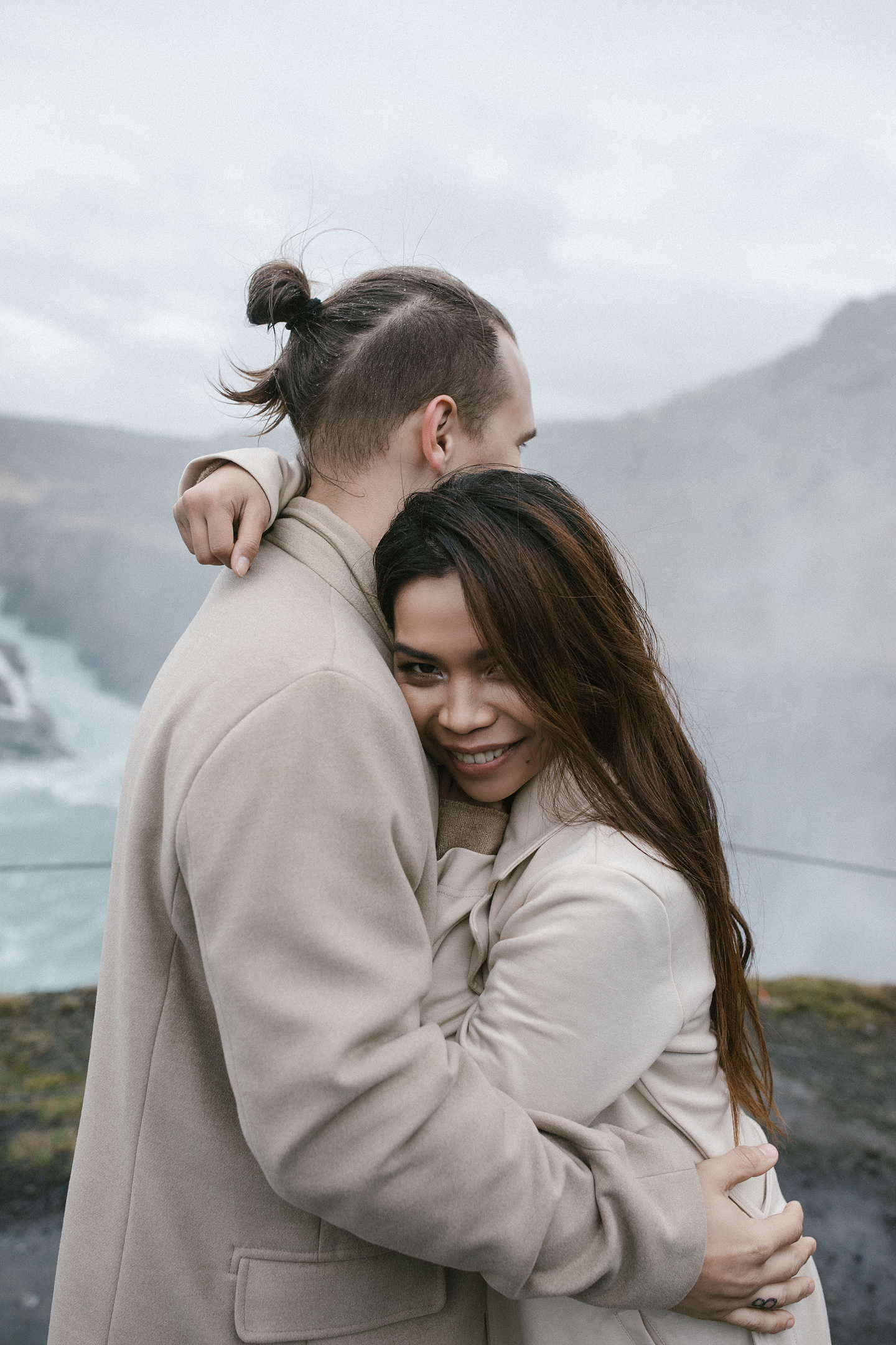 Neila & Nikita left Reykjavík to breathe in the wild air of Iceland. The roads carried them into a landscape that smelled of sulfur and pulsed with the steam of geysers. At Gullfoss, the mist settled into their hair like a secret blessing of water and wind. On their way, they stopped to feed Icelandic horses and admired the emerald waters of a canyon. Finally, at the crater lake of Kerid, where fire once yielded to water, they stood at the edge, whispered their love to each other, and descended to the lake. There, by the shore in the rain, they kissed — as if nature itself had blessed their union.