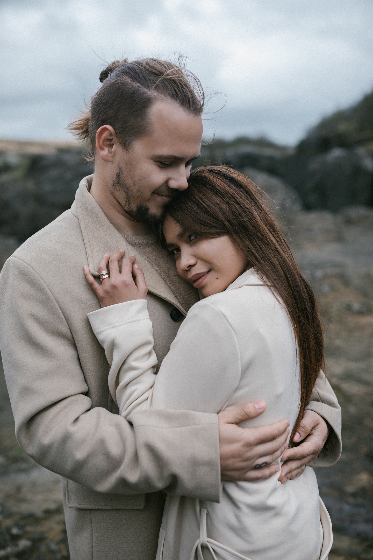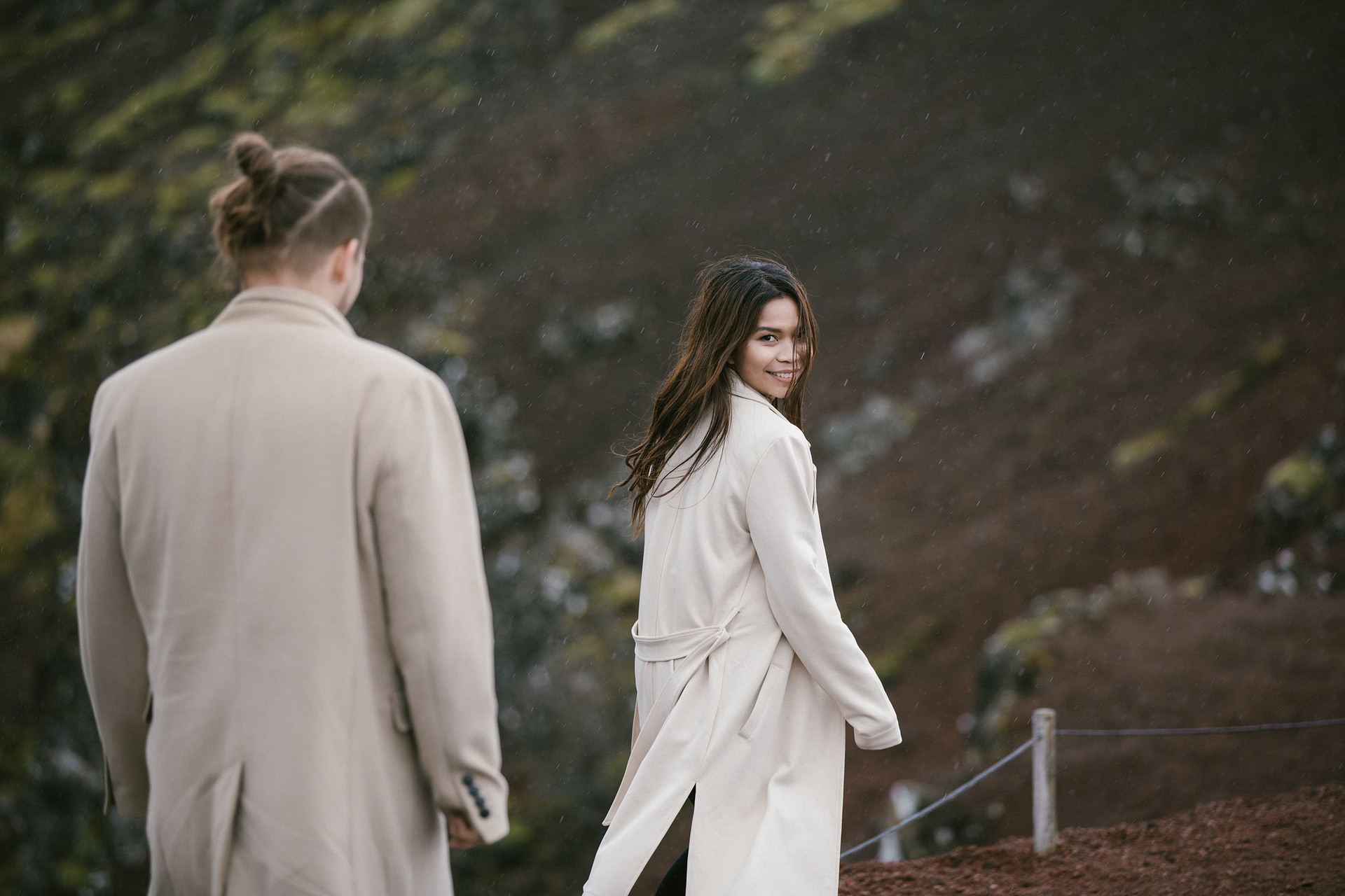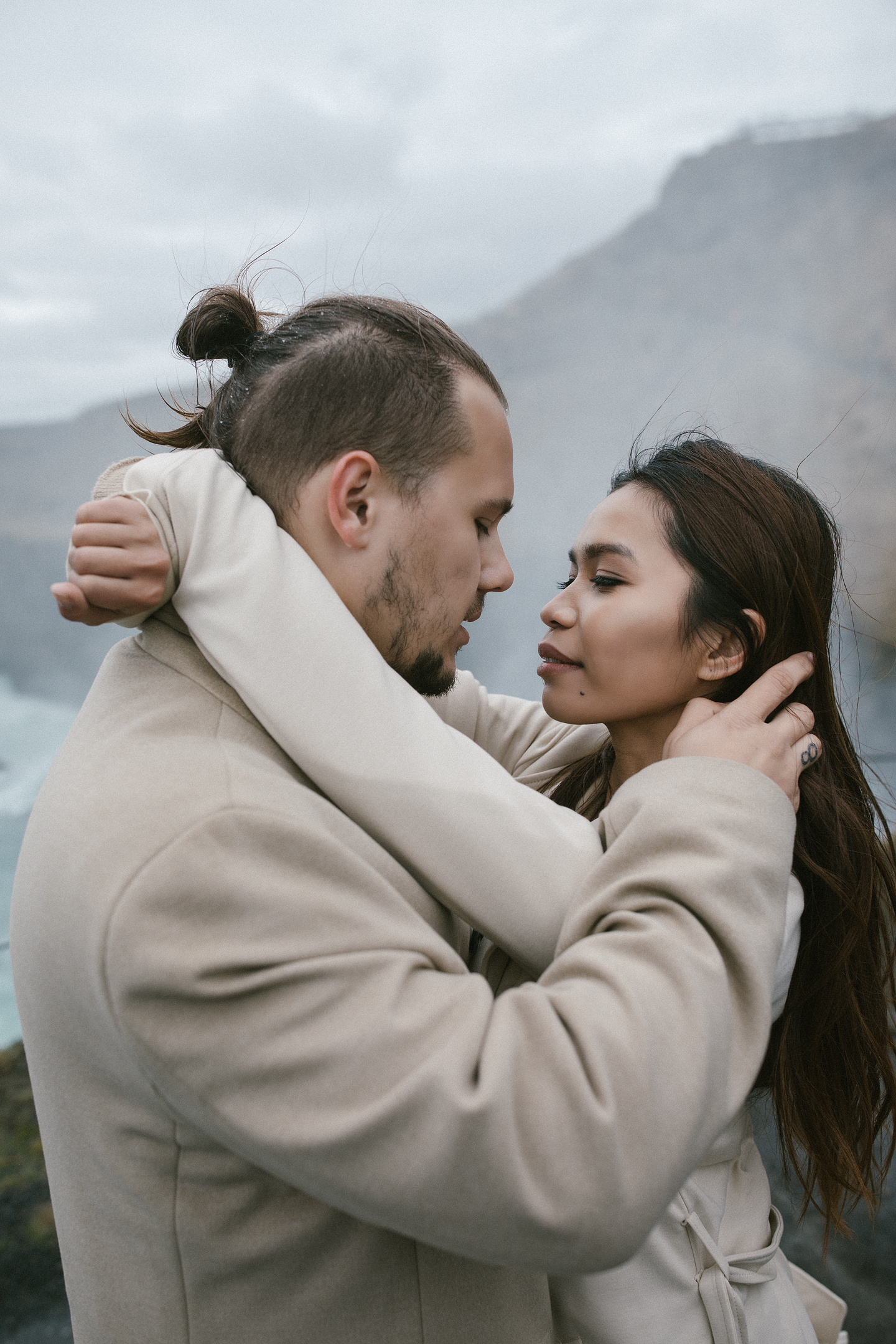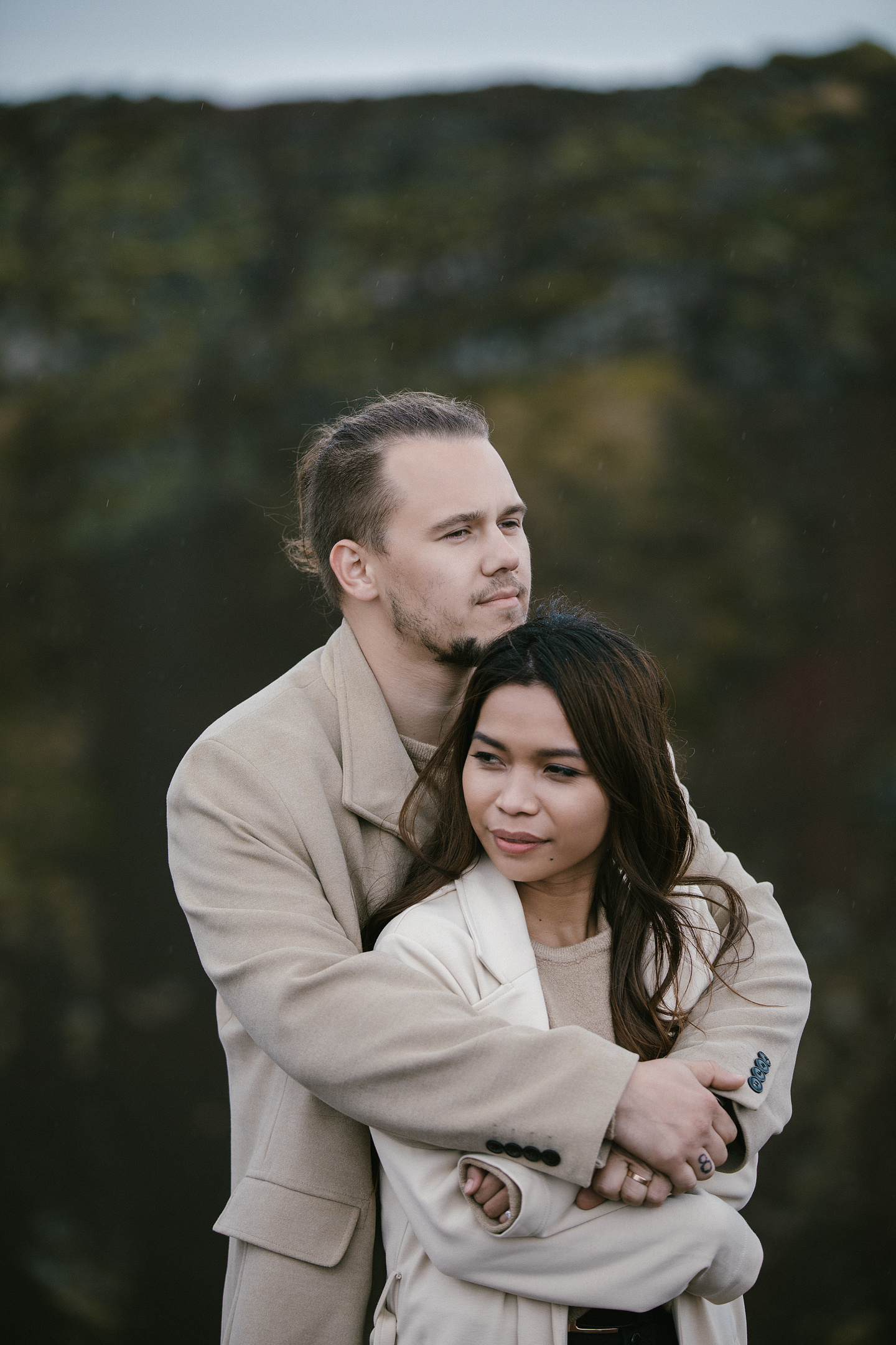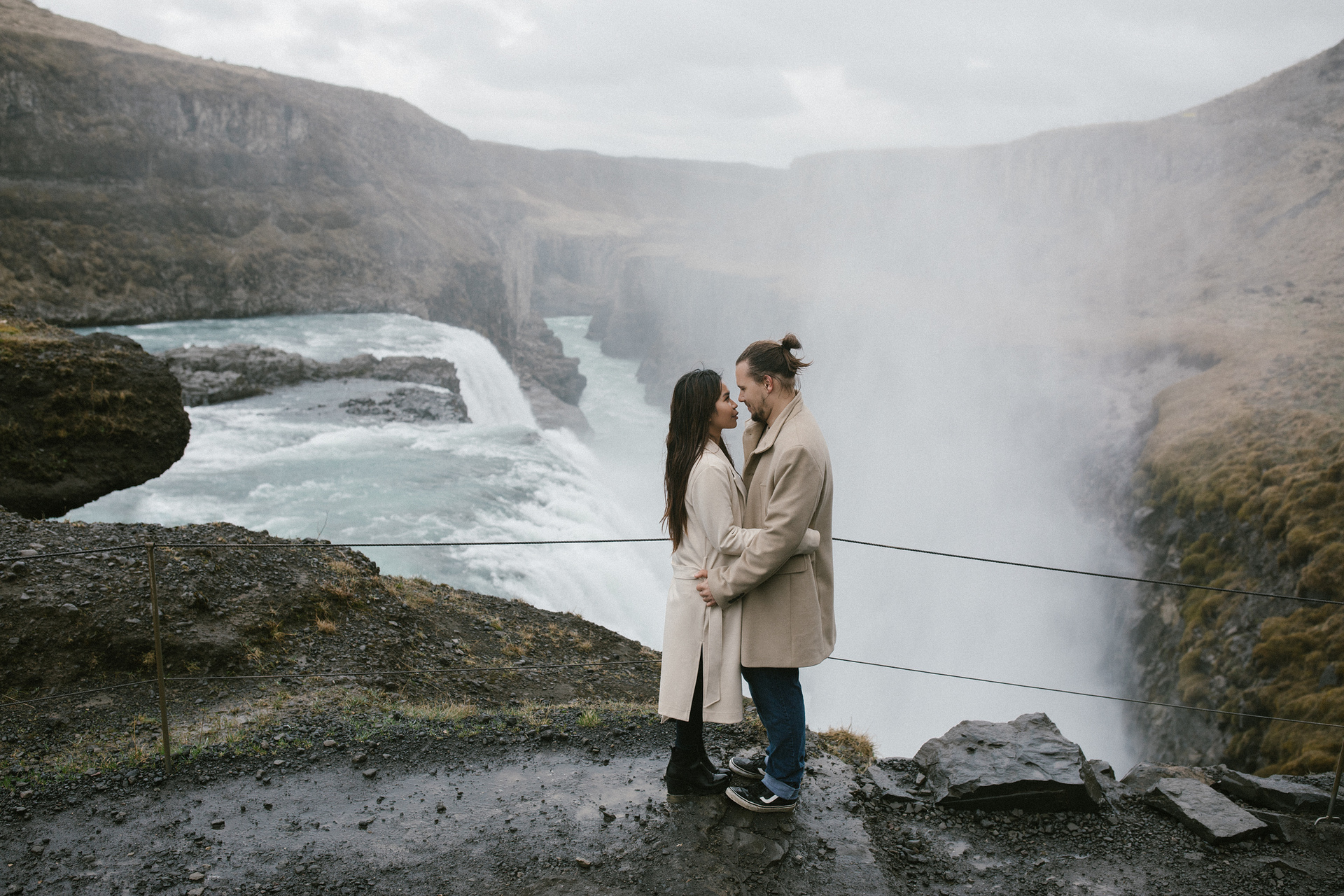 Neila & Nikita left Reykjavík to breathe in the wild air of Iceland. The roads carried them into a landscape that smelled of sulfur and pulsed with the steam of geysers. At Gullfoss, the mist settled into their hair like a secret blessing of water and wind. On their way, they stopped to feed Icelandic horses and admired the emerald waters of a canyon. Finally, at the crater lake of Kerid, where fire once yielded to water, they stood at the edge, whispered their love to each other, and descended to the lake. There, by the shore in the rain, they kissed — as if nature itself had blessed their union.